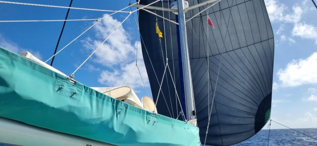 Turned out to be a wonderful passage. Definitely our best sailing one yet. We set out with a following wind of 15knots which had us running along, main with 3 reefs and jib out to windward at 6 to 7 knots. We have discovered that this is a great downwind rig. The main fills the jib but does not interfere. With 3 reefs in it also means that it is very easy to handle (even at night) if the wind gets up or we hit a squall. The second day the wind dropped a little so out came the new asymmetric spinnaker we got delivered in Papeete. It went up without hitch (not a guaranteed event) and the boat went so well – 7 to 9 knots and smooth running. We were very happy – especially when we succeeded in bringing it down again at the end of the day (not going to push our luck at night). Of course, all this meant we were now ahead of schedule and had to slow down to make sure we got to the Lau group in daylight. The wind was supposed to drop, but it stayed steady which in any other circumstance would have been perfect.