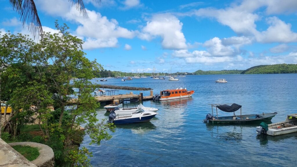 We had one of the best meals we have had on our final evening in Tonga, at a restaurant called Kraken. We remembered this restaurant from our last visit as it had a very similar boat to our old boat Vagabond Heart, on its premises which at that time housed a family. The restaurant was rebuilt during Covid and was actually constructed around the boat, (which I have subsequently found out was a Formosa 51 called Fair Seas – but obviously not in its terminal phase). The boat has been renovated, decoratively painted & polished and now forms the centrepiece of the bar! It looked fabulous & we were pleased to see it again. Not only that, the food was great, (coconut snapper with a creamy lime sauce for me & Bill had local crispy pork belly), washed down with AUSTRALIAN wine whilst overlooking Neiafu harbour. A rather belated birthday celebration for Bill!